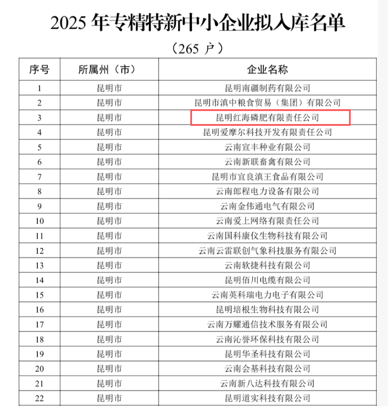 公司旗下紅海磷肥榮膺云南省專(zhuān)精特新中小企業(yè)稱(chēng)號(hào)